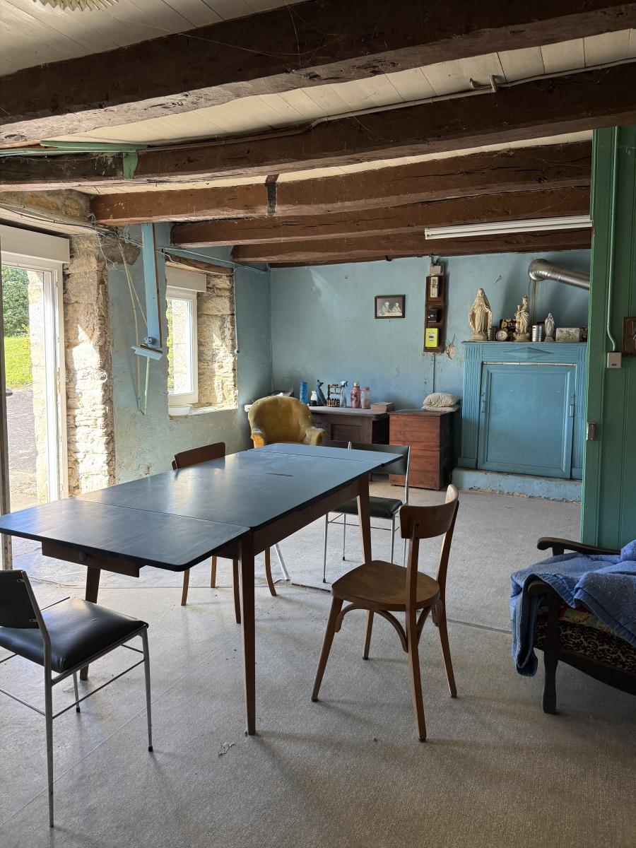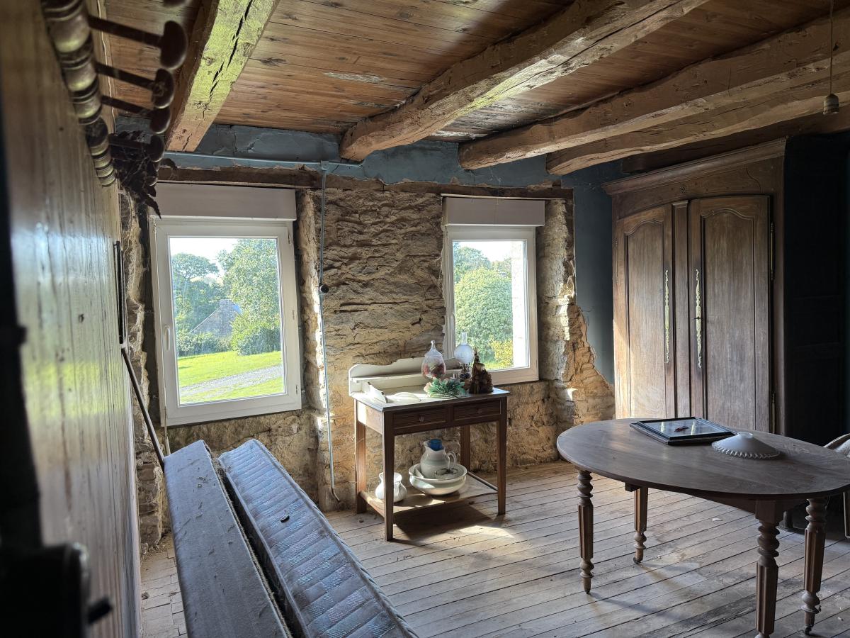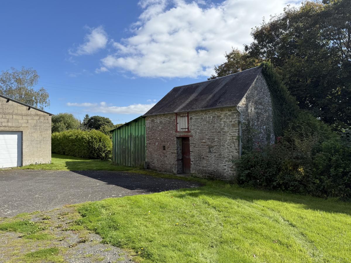 Très jolie maison en pierres, indépendante sur 3290 m² de terrain, composée d'une pièce en rez-de-chaussée, de deux chambres à l'étage et grenier au-dessus. Garage accolé. Dépendance (petite bâtisse en pierres sous ardoises d'une pièce terre battue et grenier au-dessus).