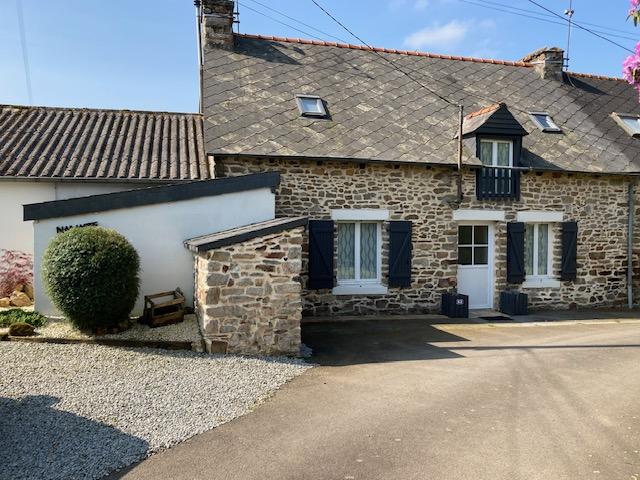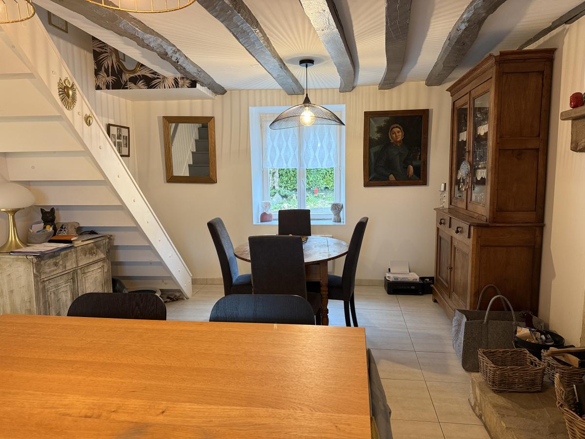 Sur terrain de 1200 m2, jolie maison en pierres, mitoyenne d'un côté, entièrement rénovée et comprenant en rez de chaussée une entrée, une cuisine équipée ouverte sur une salle à manger avec cheminée et poêle à bois, un salon, une salle de bains et wc ; étage de trois chambres et une petite pièce. Garage et débarras. Dépendance. Puits.